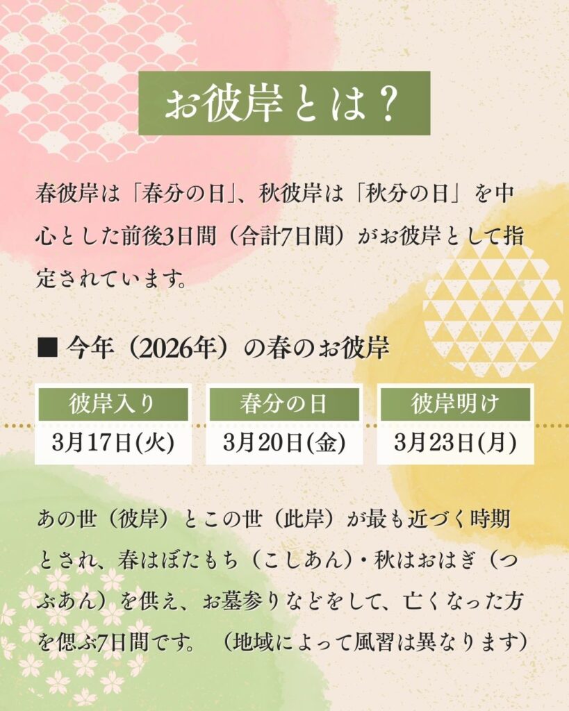 まもなく春のお彼岸です。春は卒業や入学、新しいスタートをきる季節。お彼岸のお参りの時には、ご先祖様には伝えたかった事、報告を兼ねてお参りするのもいいですね。